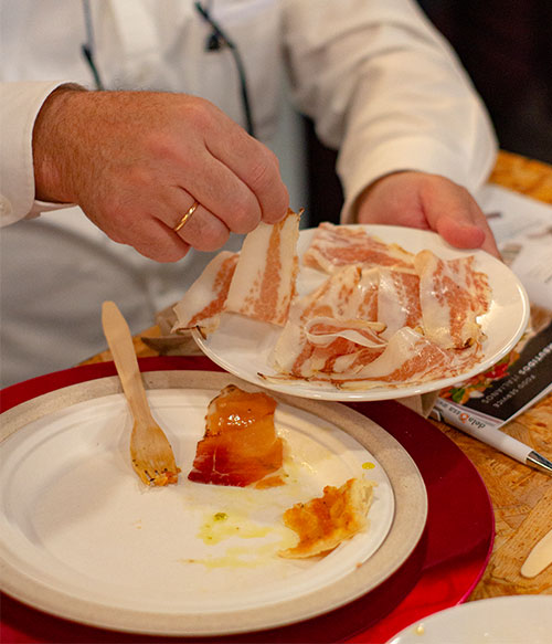 - Guanciale: Una carbonara original italiana, ni lleva nata ni lleva bacon. El guanciale es muy parecido al bacon o a la panceta, pero se diferencia de ellas claramente en los aromas y el sabor. Pudimos probarlo al natural, sobre pinsas y tras un ligero paso por la plancha y su sabor es espectacular.