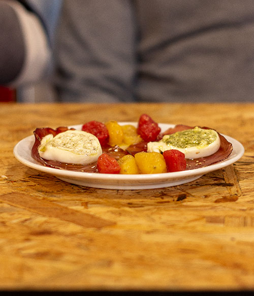 - Mozarella y tomate semiseco: No podía faltar en nuestra cata este clásico italiano. No hay una combinación mejor de sabores que la que nos aporta la mozarella di buffala, la salsa pesto y el tomate semiseco. El entrante perfecto.